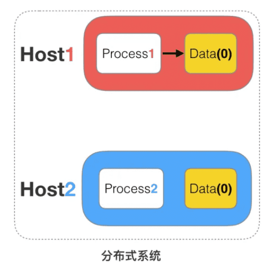 以以下场景为例,一个分布式系统系统中有两个节点 Host1 和 Host2,它们之间通过网络联通,Host1 运行程序 Process1 和数据库 Data,Host2 运行程序 Process2 和数据库 Data。