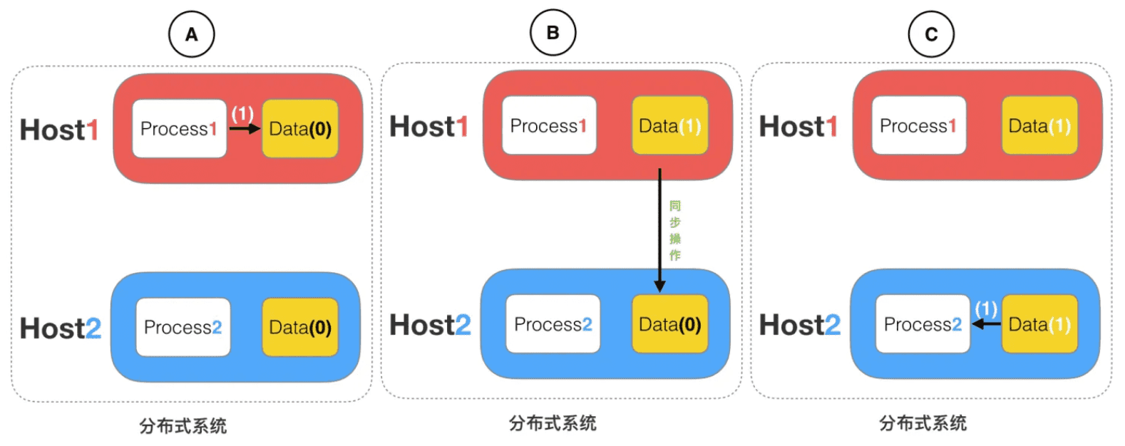 满足一致性要求 Host1 和 Host2 中的 Data 的数据相同,满足可用性要求不管用户请求 Host1 还是 Host2 都会立即响应结果,满足分区容错性要求 Host1 或者 Host2 任一方脱离系统都不会影响分布式系统的正常运作。