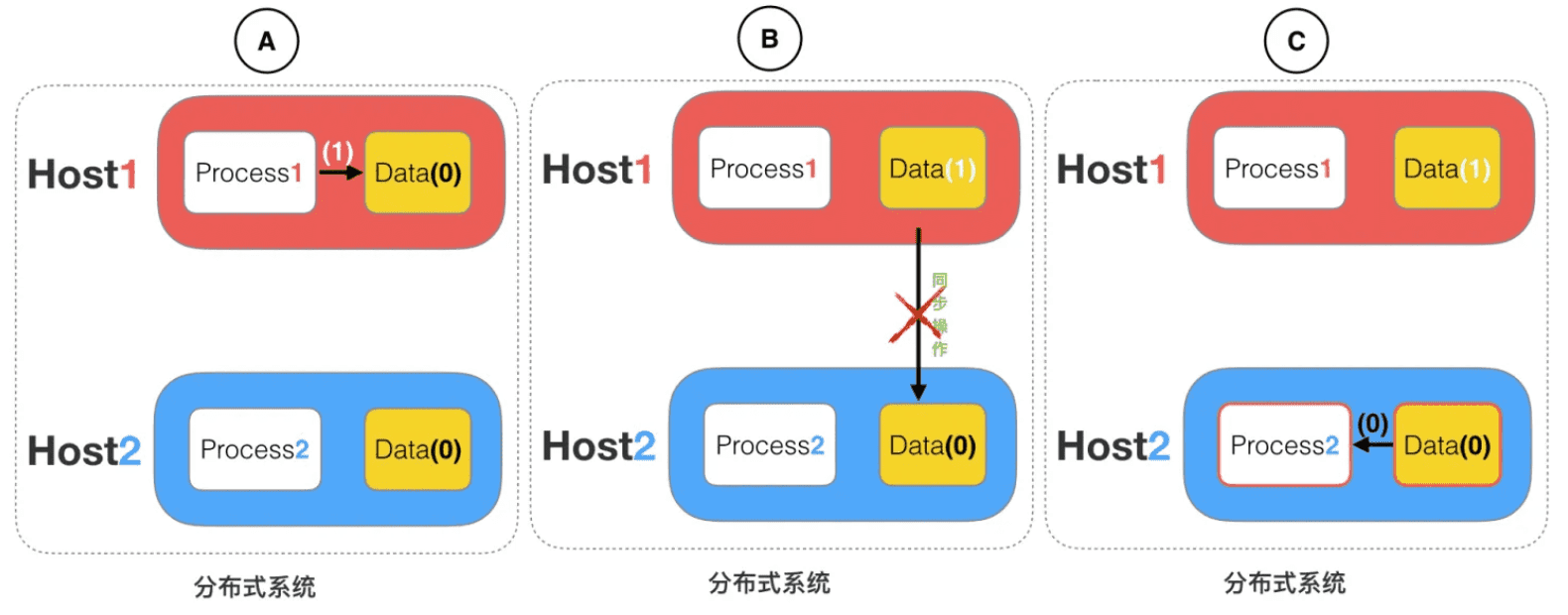 假如这时候发生了网络异常,Host1 和 Host2 之间的网络断开了。首先向 Host1 请求更新数据,将 Data 中的数据从 0 更新为 1。由于网络问题,Host2 中的数据无法同步至最新。用户向 Host2 发送读取请求是,无法立即将最新的数据返回给用户。