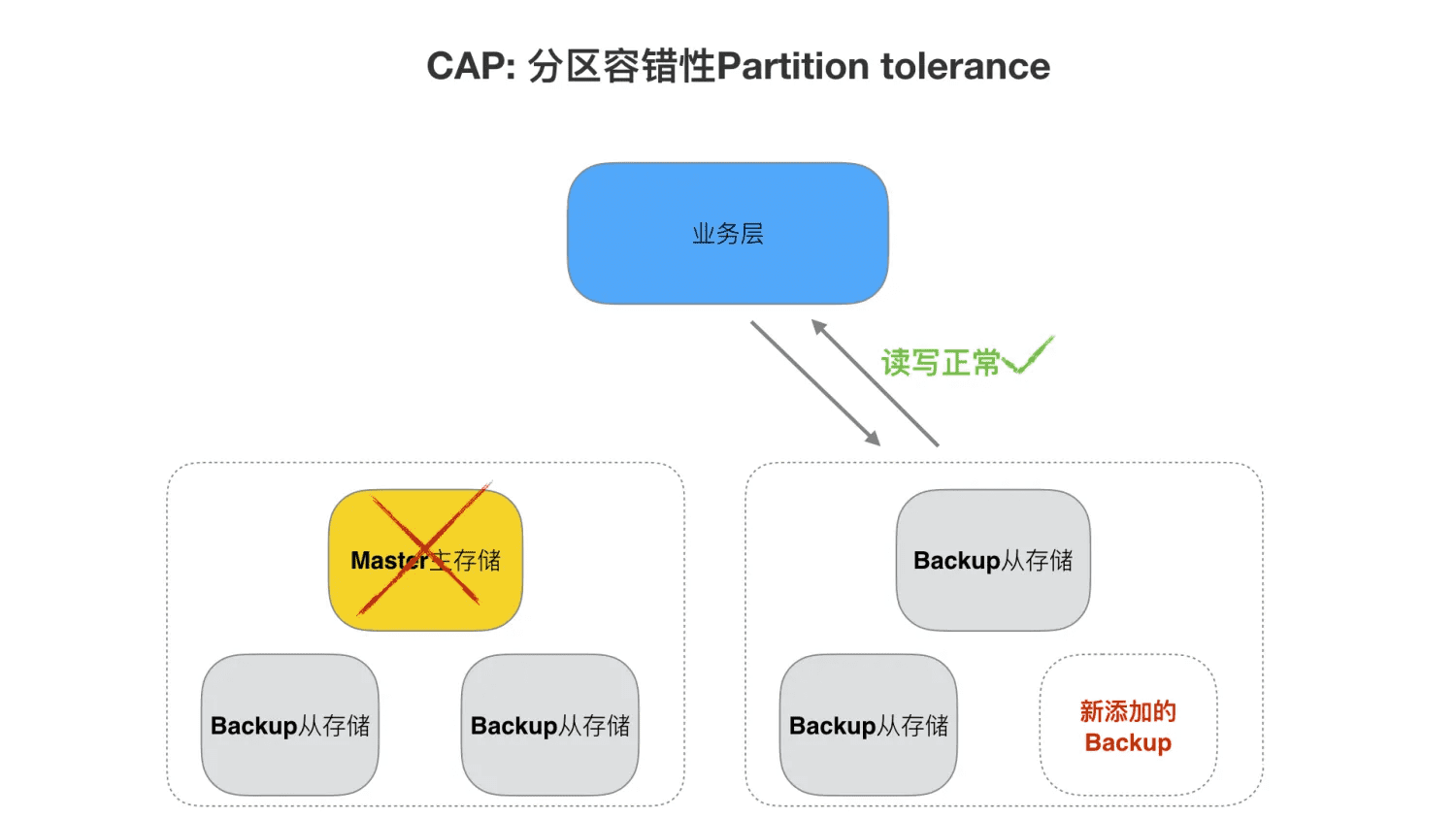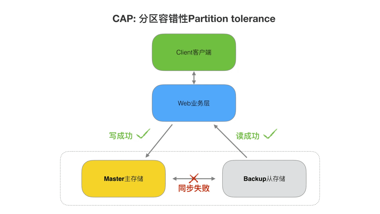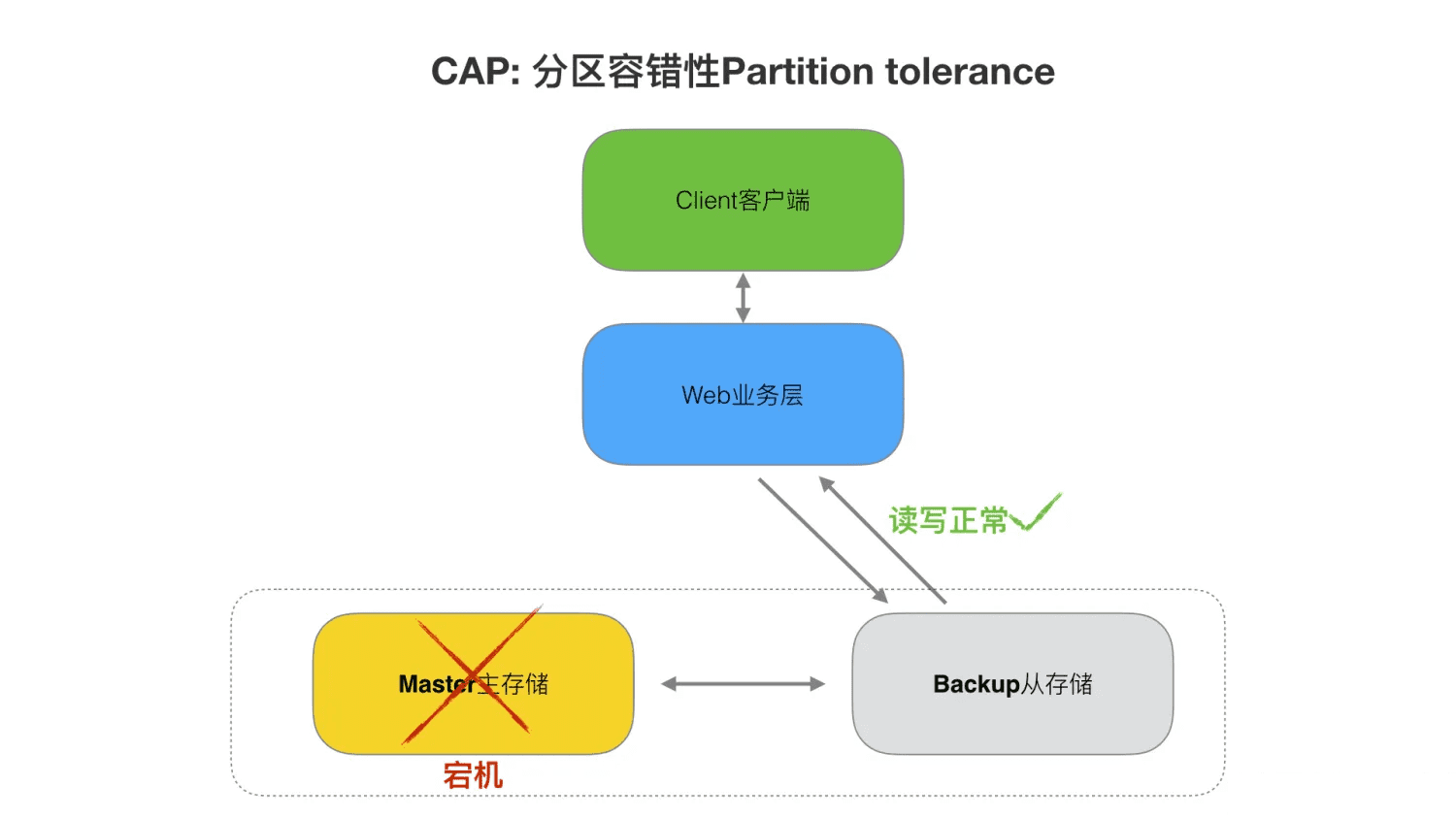 分区容错性的目标是主存储向从存储同步数据失败时,不影响读写操作,其中部分节点出现故障不影响其他节点对外提供服务。