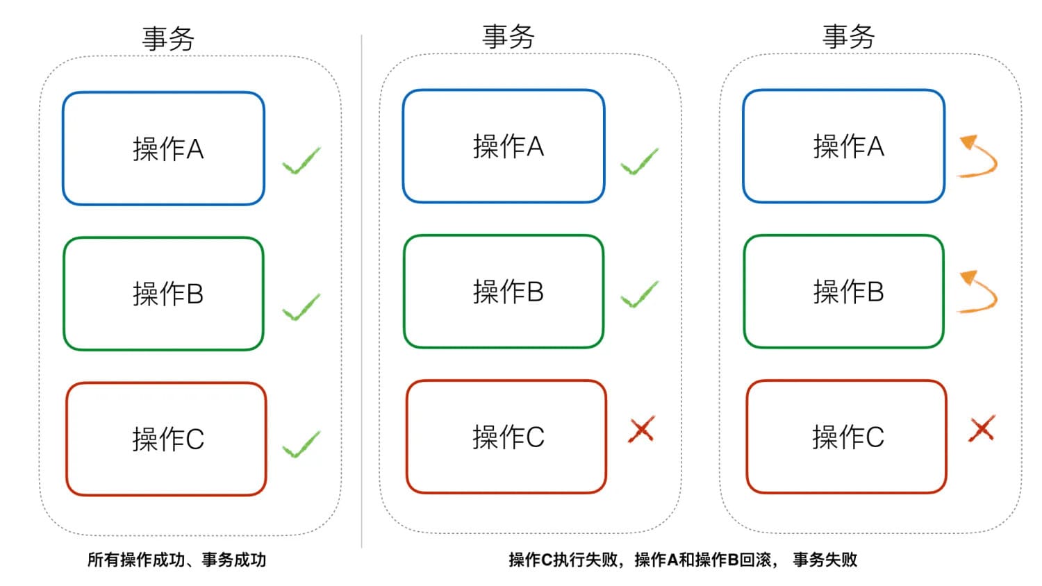 - 原子性指整个事务中的所有操作,要么全部完成,要么全部不完成,不会出现部分完成的情况