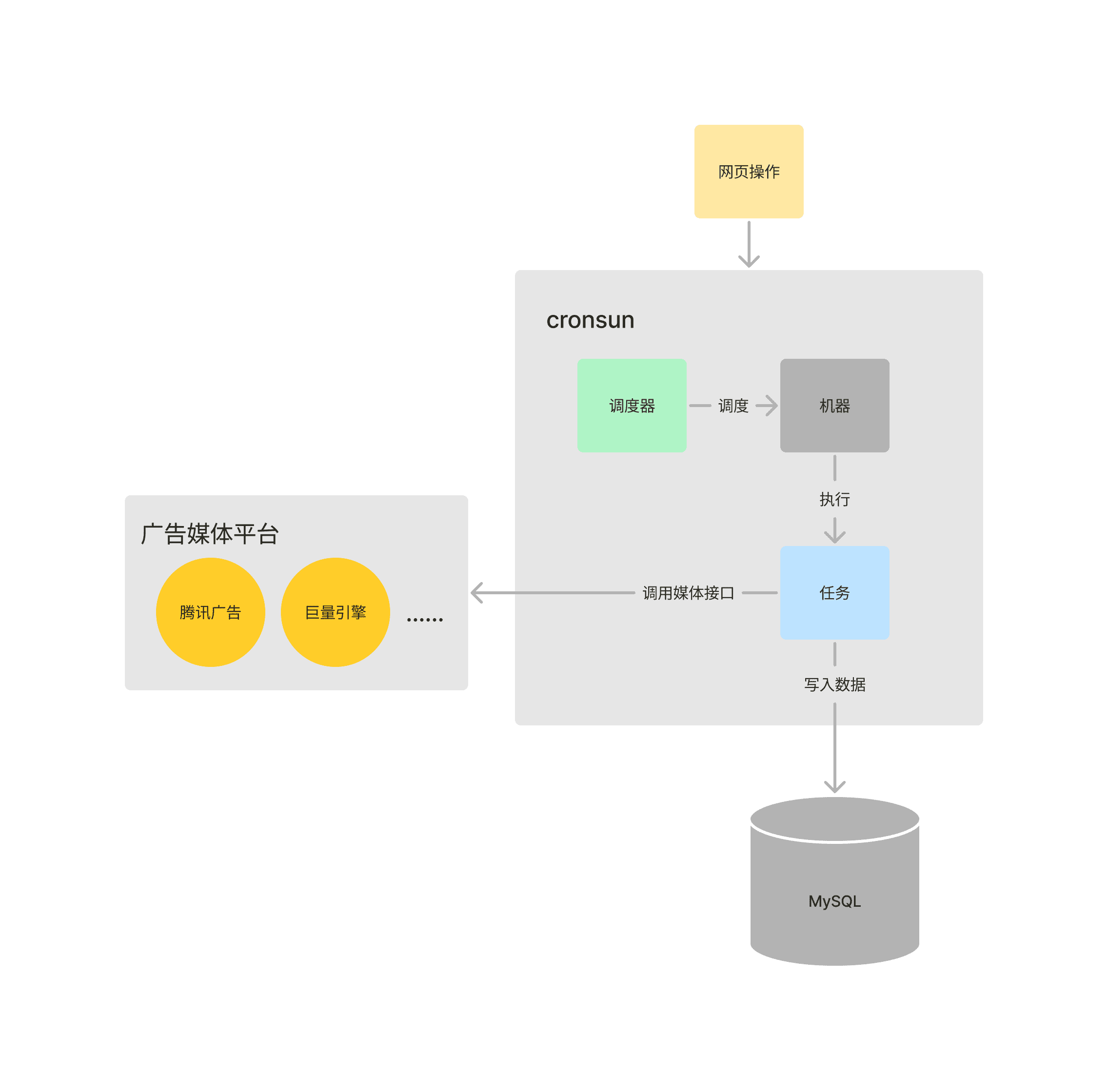 在几台物理机上部署 cronsun 分布式任务系统,将所有媒体平台的账户 token 刷新、广告配置拉取、效果数据拉取、各种数据同步的任务,以 Python 脚本的形式实现,并通过 cronsun 定时执行任务脚本。