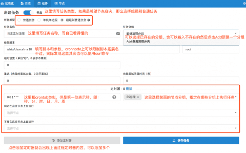 通过网页界面,可以配置一个任务的任务名称、执行脚本、执行时间 cron 配置,并选择要执行的机器。