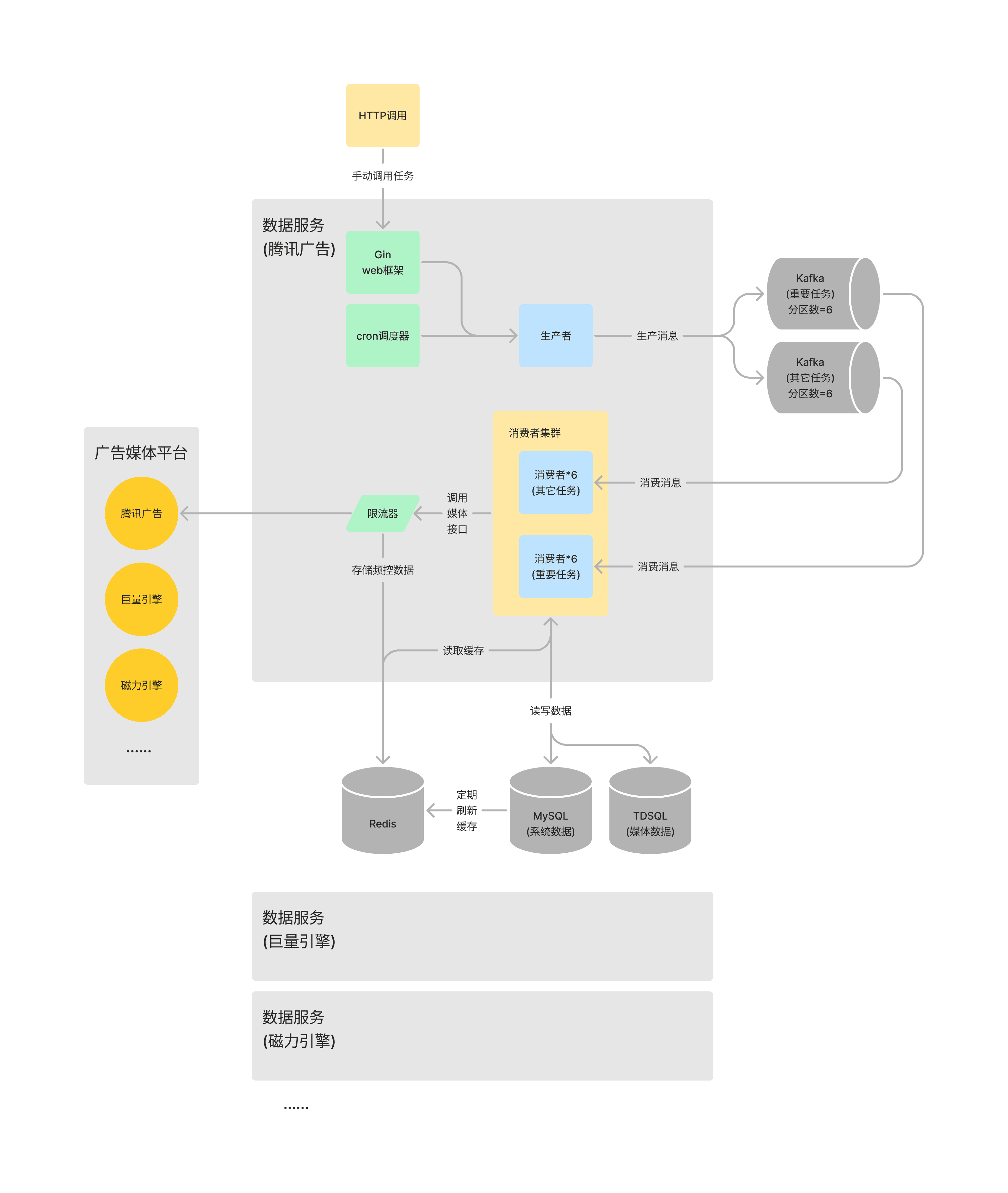 单体数据服务的种种缺陷,促使我们再次升级架构,将每个广告媒体平台的任务分别拆分为一个数据服务,且每个媒体的数据服务都改造为分布式服务。