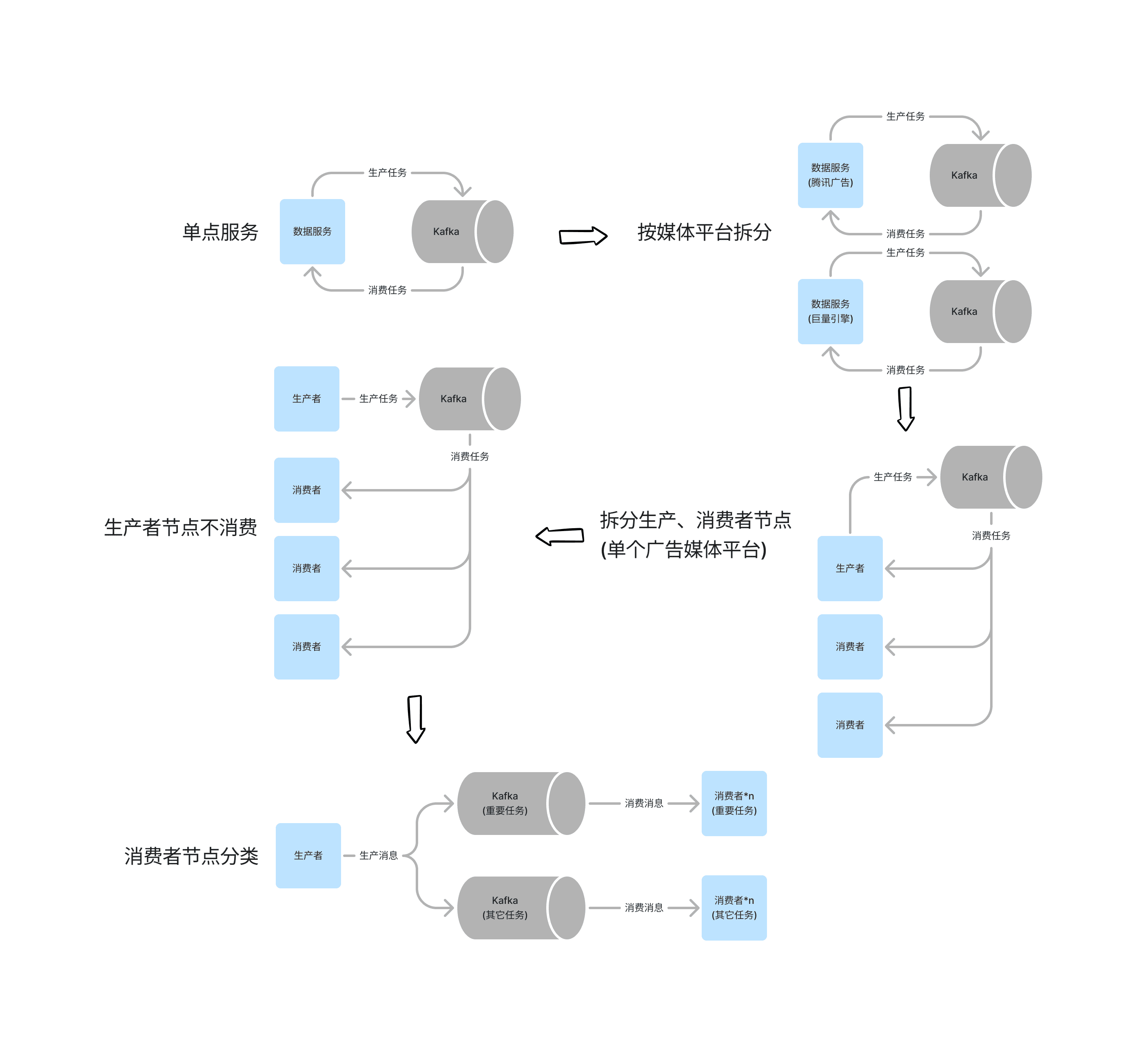 为了消除各个媒体平台之间任务的相互影响,我们对单点的数据服务进行了拆分,每个媒体平台拆分为一个代码仓库和独立部署,且分别使用独立的 Kafka 主题。