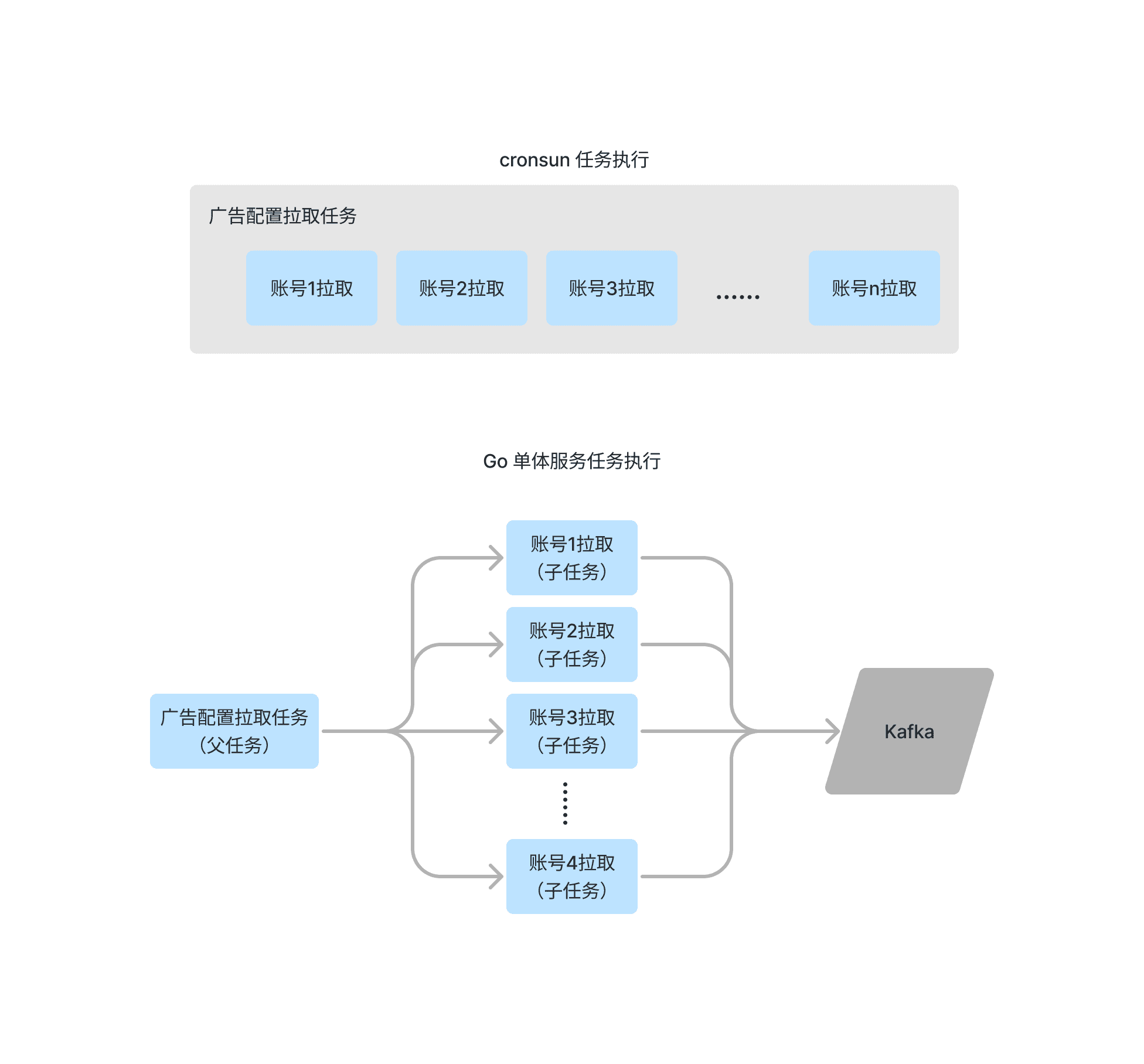 相比于 cronsun 中任务对于多个媒体账户的串行执行,现在将任务分为了父任务和子任务两种任务类型,例如需要拉取 100 个账户的广告配置,父任务的工作就是创建这 100 个子任务,每个子任务的工作就是对应其中一个账户的广告配置拉取。子任务会被写入 Kafka,然后再从 Kafka 中读取消息执行子任务,实现生产子任务和消费子任务的解耦。该单体消息服务即是生产者也是消费者。