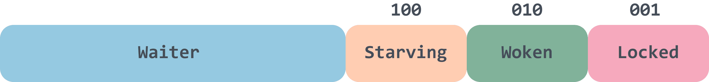 state 字段有 32 位长度,可以分为四部分。最低的三位分别表示 mutexLocked、mutexWoken、mutexStarving 三个状态,mutexLocked 表示 Mutex 是否已上锁, mutexWoken 表示从普通模式被唤醒,mutexStarving 表示是否属于饥饿模式。后面 29 位用于记录等待互斥锁协程数量的计数器 waiter,最多可以表示 2^29 个协程正在等待该互斥锁。