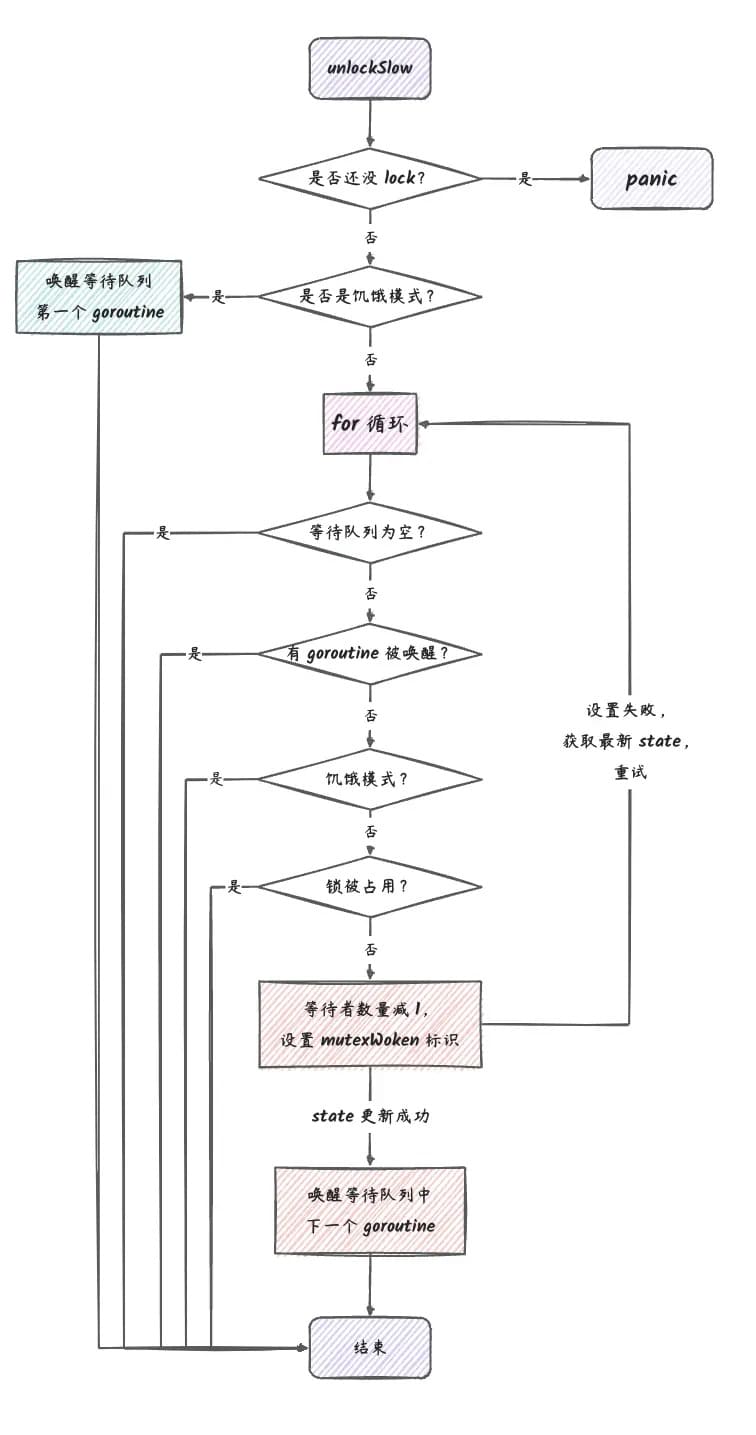 Unlock 方法释放锁,并通过信号量来唤醒阻塞获取锁的协程。根据 Mutex 属于普通模式还是饥饿模式,区别在于唤醒等待队列的任意一个或者是队首的等待协程。
