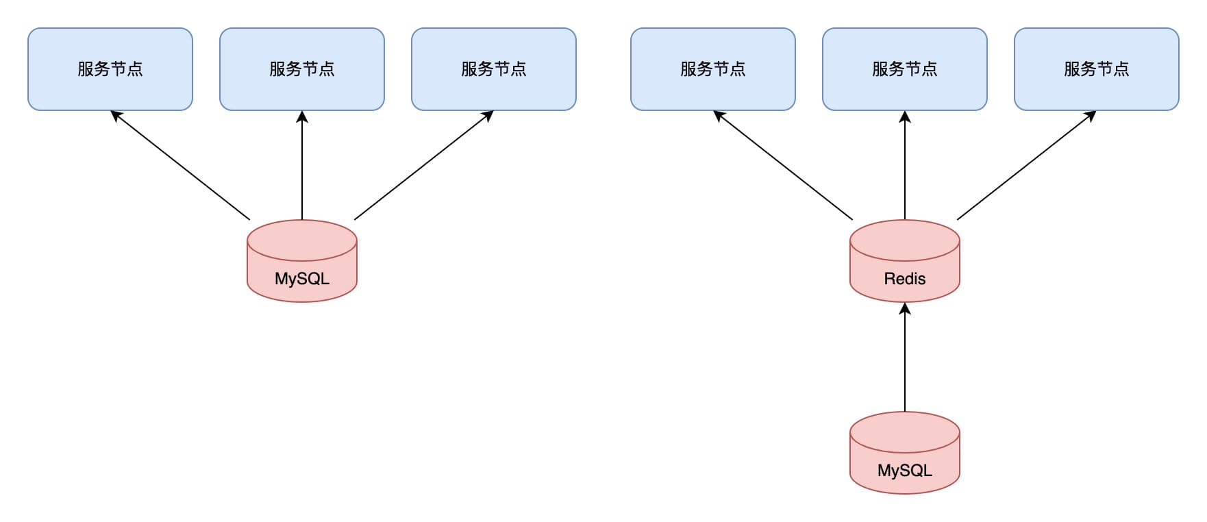 在以下场景,数据库中存在一部分读多写少的数据,我们的服务存在多个节点,每个节点定时将这部分数据读取到服务节点的内存中,当需要读取这部分数据时直接从内存读取。随着业务的发展,这部分数据满满变大,服务的节点数量也在增多,定时将数据读到每个节点内存的操作逐渐给底层数据库带来了明显压力。