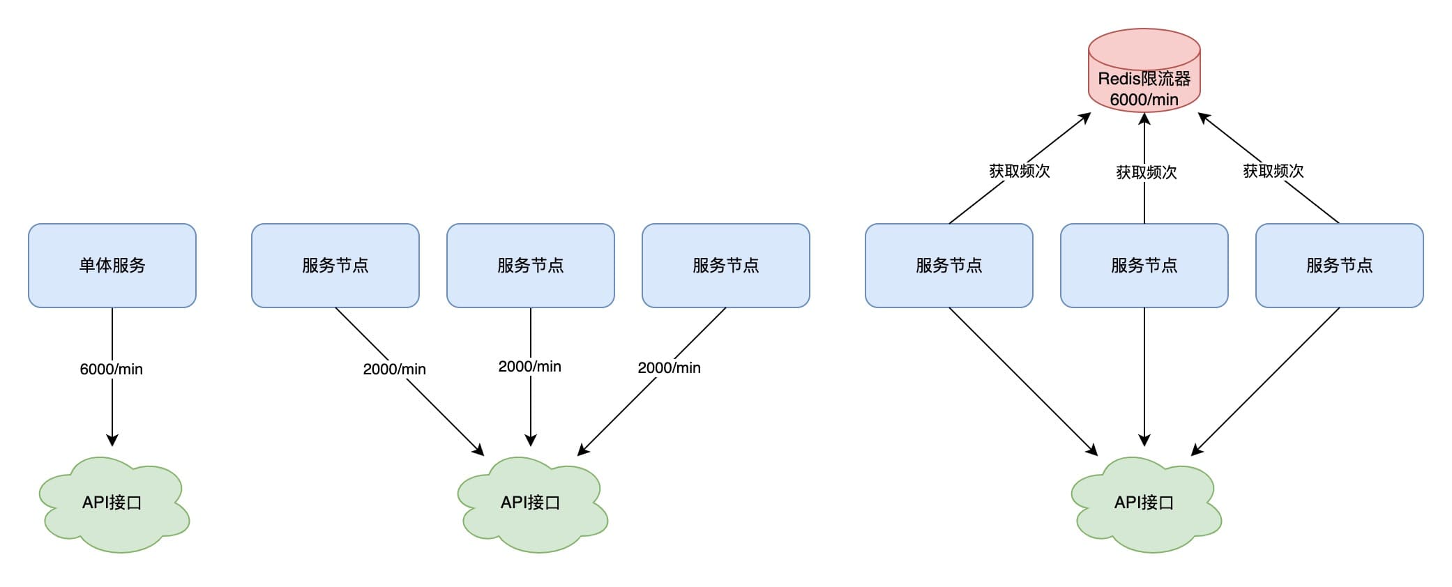 假设该 API 接口调用频次限制是 6000 次每分钟,当我们的服务是单点服务时,可以在配置文件里将频次配置为 6000。当服务增加到 3 个节点时,需要手动将配置文件的频次改为 2000,当服务再增加到 6 个时,则需要再手动改为 1000。每次加减节点需要频繁手动调整配置文件,且当部份节点因为网络或其他原因没有用满平均频次的话,这部分频次无法供其他节点所用,相当于浪费掉了。