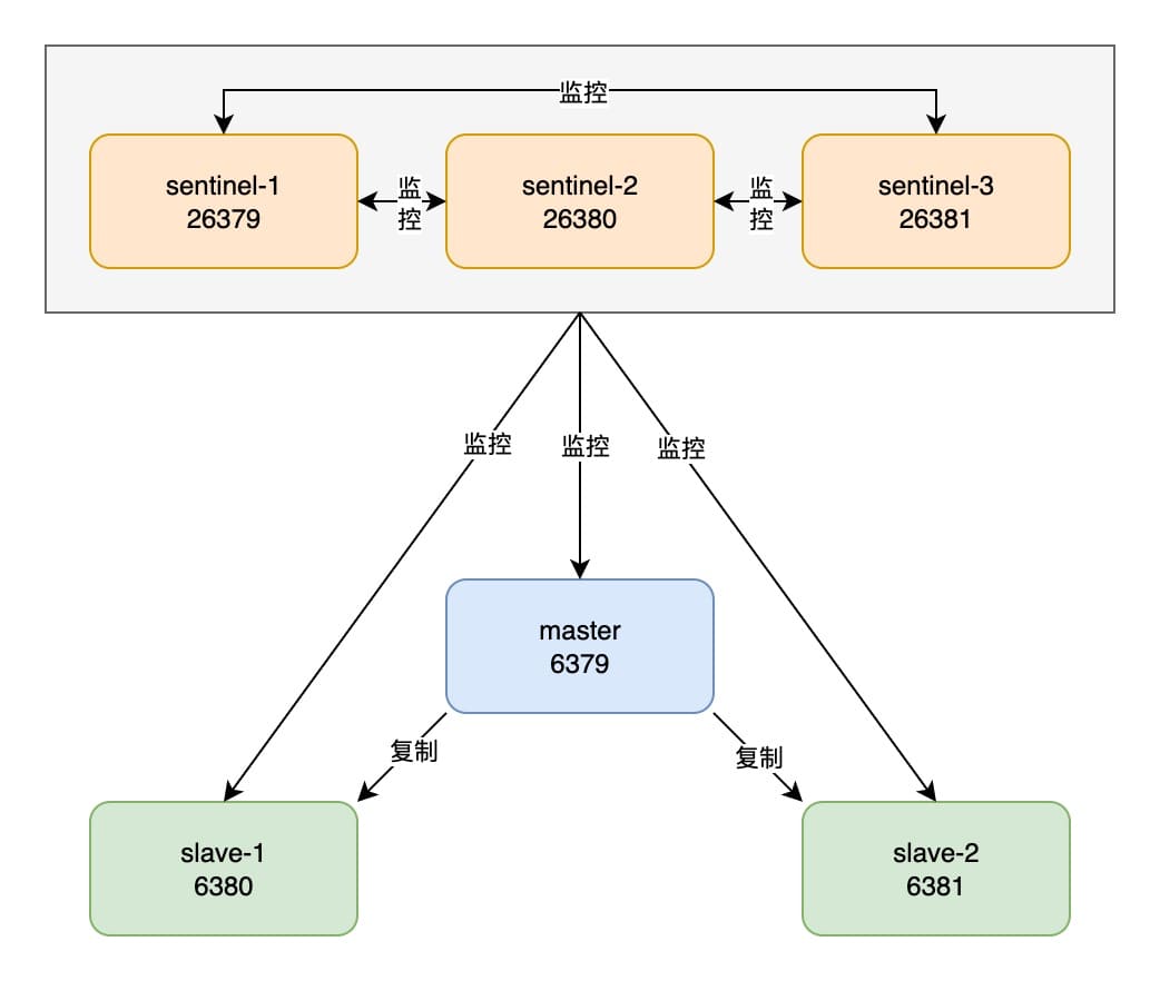 建议部署至少为 3 的奇数个 Sentinel 节点,避免脑裂问题。生产环境的各个 Sentinel 应该分布在不同的物理机上,下面例子使用不同端口号仅用于测试。