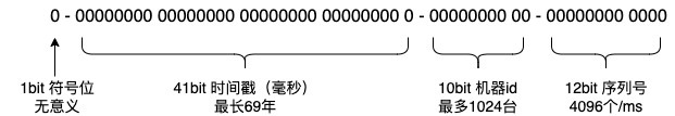 一个 snowflake id 有 64 bit,包含 1 bit 符号位(始终是 0)、41 bit 毫秒时间戳(最长可以记录 69 年)、10 bit 机器 id(最多 1024 台机器)、12 bit 序列号(最多每毫秒 4096 个序列号)。